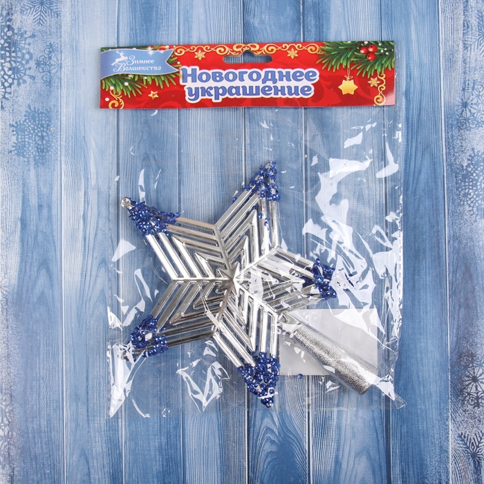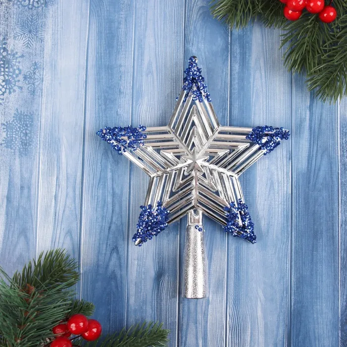 Эта звезда — больше чем традиционная верхушка. Она знаменует собой завершение оформления ёлки и задаёт её общее настроение. Её серебристый оттенок с синими переливами напоминает ночной снег или зимнее небо перед рассветом. Размер 18 см делает её идеальной для высоких ёлок — она остаётся заметной, но не перегружает композицию.