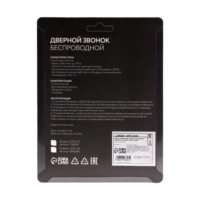 Звонок Luazon LZDV-07, беспроводной, 2хAA (не в комплекте), LR23A, белый — Характеристики