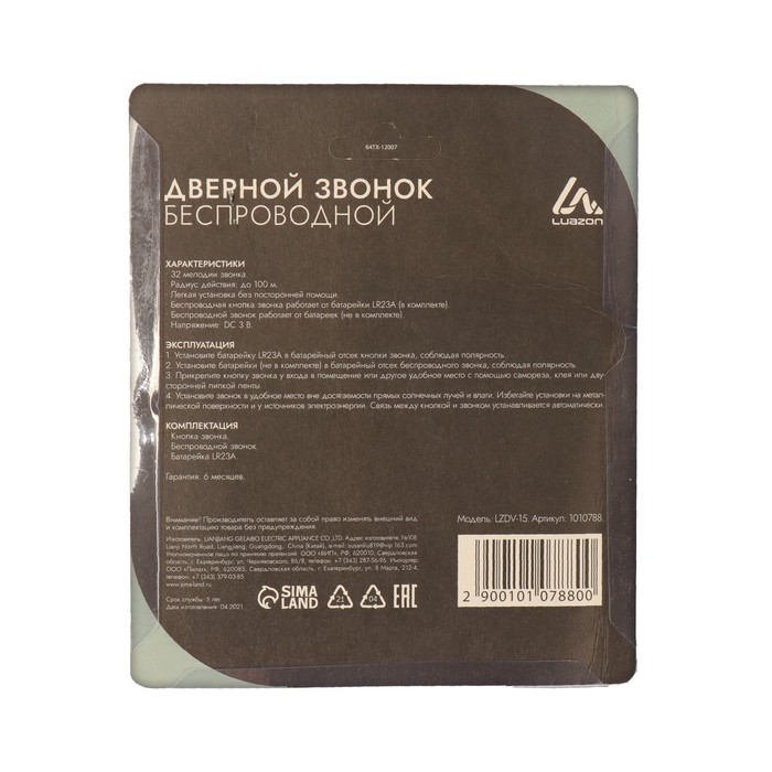 Звонок Luazon LZDV-15, беспроводной, 2хAA (не в комплекте), LR23A, бело-голубой — Характеристики