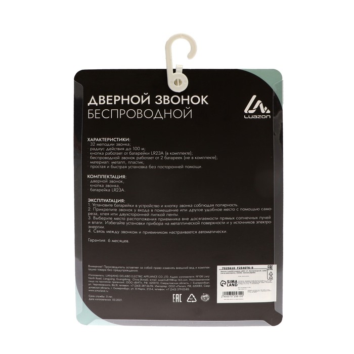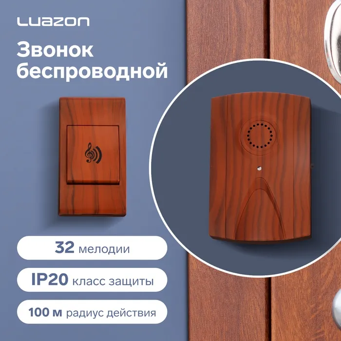 Звонок Luazon LZDV-17, беспроводной, 2хAA (не в комплекте), LR23A, темное дерево — Характеристики