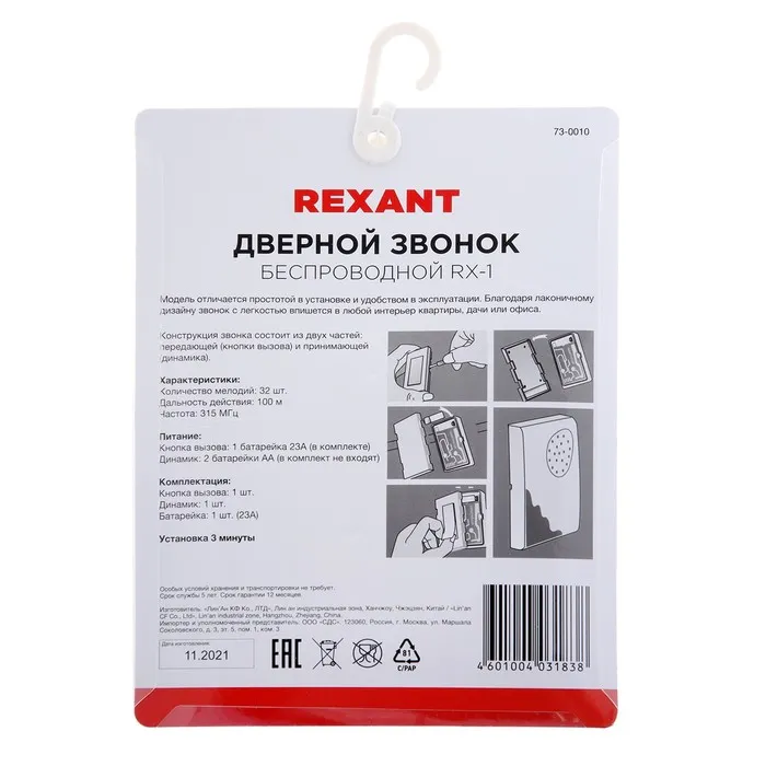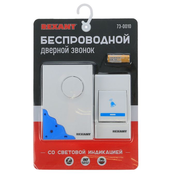 Звонок REXANT RX-1, беспроводной, 36 мелодий, 80 м, от батареек/220 В, белый — Характеристики