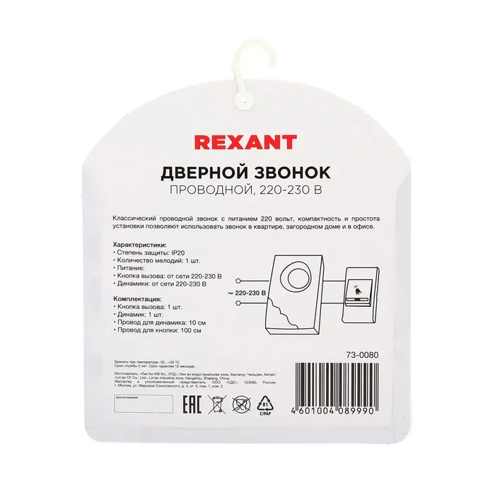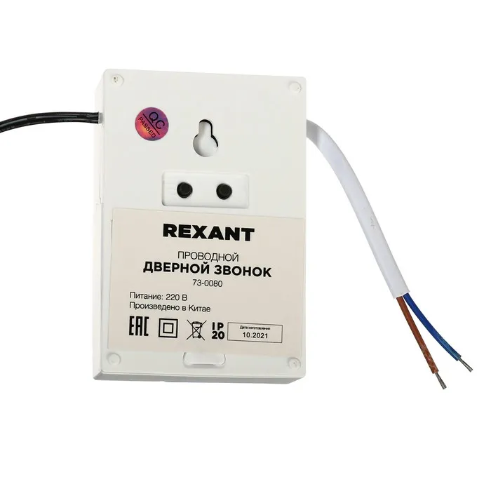Звонок REXANT RX-8, проводной, 220 В, регулировка громкости, белый — Характеристики