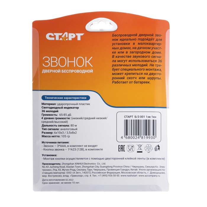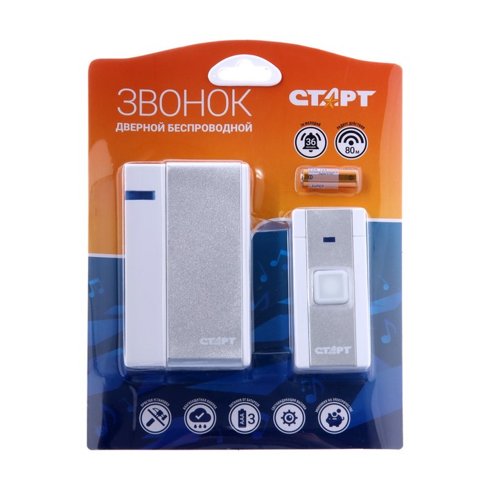 Беспроводной звонок СТАРТ Б/З 001 полезен в помещениях, где установка стационарного звонка на внутренней проводке невозможна. Устройство подходит для квартир, частных домов или закрытых офисов. Широкий радиус действия звонка 80 м даёт возможность устанавливать его в загородных домах с большим расстоянием от дверей до ворот.